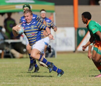 Ruan Jacobs, Waterkloof se woelige haker, op die aanval in die rondomtalie-stryd van die SDC Noordvaal Cup se Beker-afdeling teen Hoërskool Rustenburg in 2024. FOTO: Marius Nortjé.